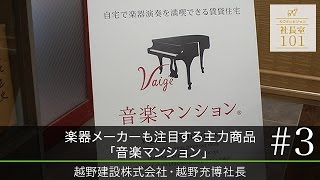 2018年5月、越野建設の越野充博社長にお話を伺った。同社は総合建設業として、学校などの公共施設をはじめ、商業ビルや住宅など民間の建設・リノベーションまで手掛ける100年企業だ。中でも成長著しいのは、楽器対応賃貸「音楽マンション」。現在、国内トップシェアを誇っており、2018年の春には24棟目が完成した。今、設計・施工中を含めるとすでに30棟に達するという。なぜ越野建設の「音楽マンション」が国内トップシェアを獲得するまでに急成長したのか。その背景を伺うと、建物というハード面だけでなく、ソフト面の強化も同時に進めてきたと越野社長は語る。その取り組みの1つに、「音楽マンション倶楽部」という入居者会員制の導入がある。この制度は、入居すると同時に入居者会員資格を得ることができ、音楽イベントに招待してもらえたり、プロ・アマ問わず音楽活動の支援が受けられたりするそうだ。また、入居希望者向けには空室状況が都度配信されるメール会員制度があり、登録するとナビ媒体より早い情報を受け取ることができるサービスだという。このような、消費者目線の手厚いサポートが音楽愛好家の心を掴んでいるのだろう。さらに、この取り組みは入居者の滞在率にも大きく効果を発揮しているそうだ。不動産物件の良し悪しを判断する指標の一つに、「滞在率」という、空室ができない状態を調べる指標があるそうだが、一般的に80%以上であれば優良と言われるのに対して、越野建設の音楽マンションは、最も古い物件でも滞在率は現在99.3%という数値が出ている。音楽マンションを拡めていく意義について越野社長に伺うと、「日本の音楽文化の裾野を拡げていきたい、音楽家をサポートできる存在でありたい」と力強く語った。(2018年5月19日 カウテレビジョン/内村桜子)